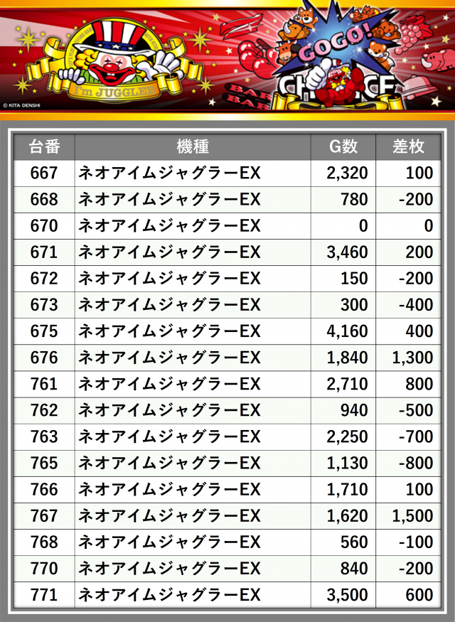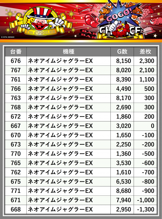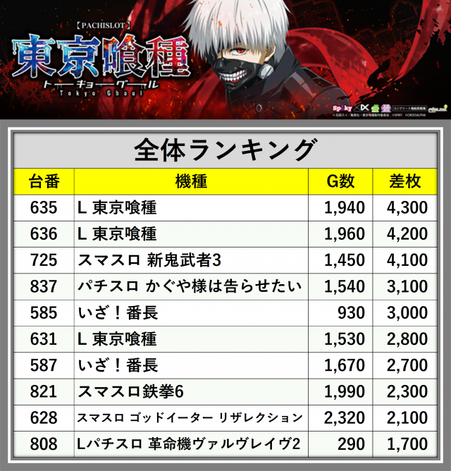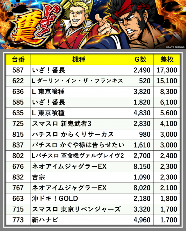 ※差枚数順に掲載しています