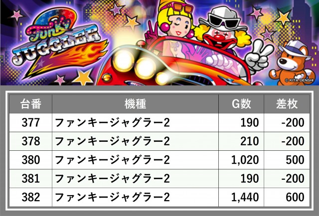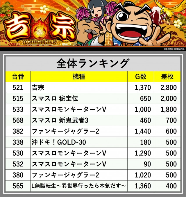 厳選された取材対象機種をはじめ、その他スロット全体から好記録が飛び出した!プレイヤーが楽しんだ1日を下記データにて振り返ってみて欲しい。