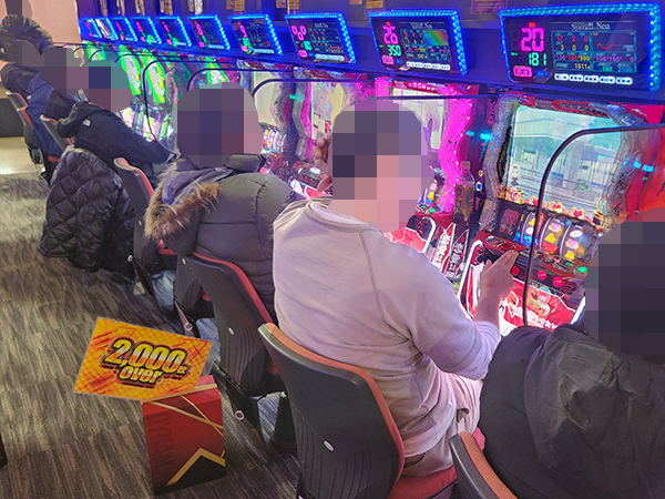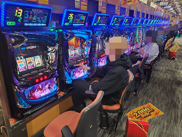 14時ごろの4円パチンコでは「e 新世紀エヴァンゲリオン 〜はじまりの記憶〜」や「Pスーパー海物語IN沖縄6」が盛況で、機種のポテンシャルをフルに活かすプレイヤーを複数確認している。