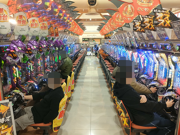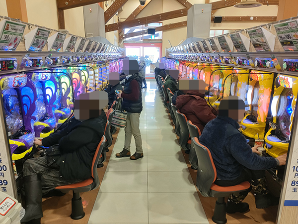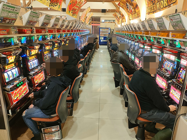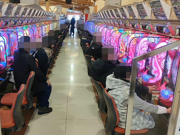 機種構成が魅力的な500円/89枚パチスロを見ると、ほぼ満席となるほどの支持を得ていた。