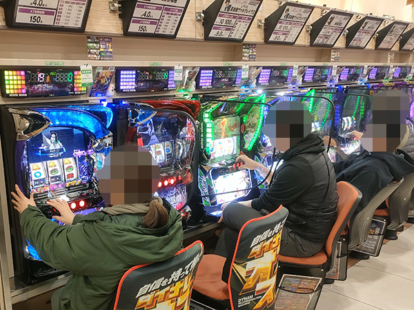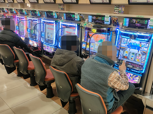 ほかにも「ゴーゴージャグラー3」などのジャグラーシリーズや、「キングハナハナ-30」が活況。微笑ましいシーンをあちこちで確認している。