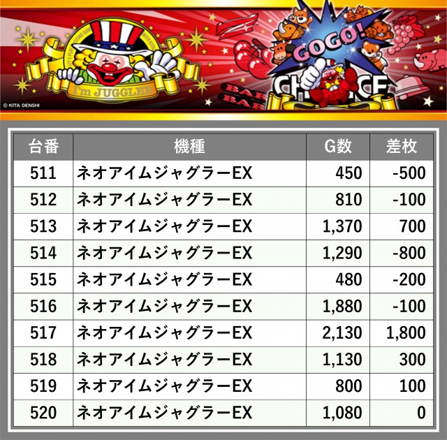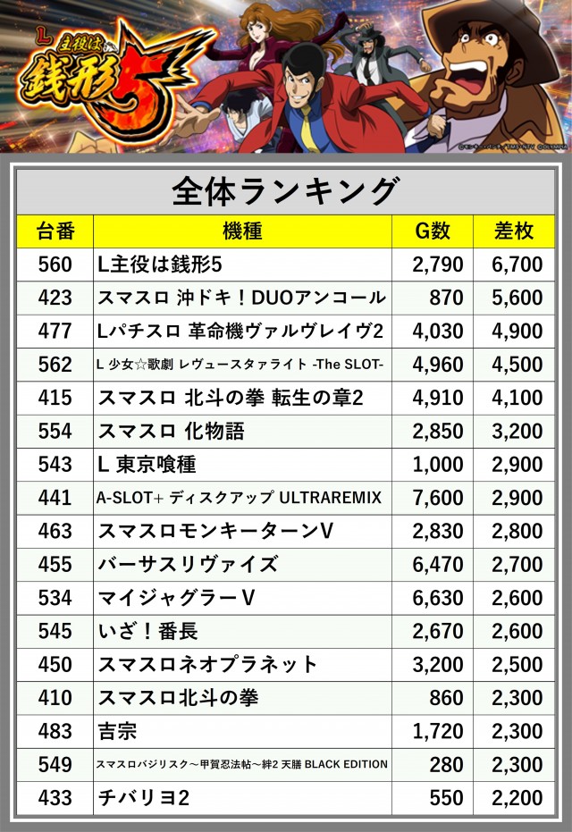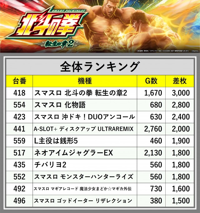 厳選された取材対象機種をはじめ、その他スロット全体から好記録が飛び出した!プレイヤーが楽しんだ1日を下記データにて振り返ってみて欲しい。