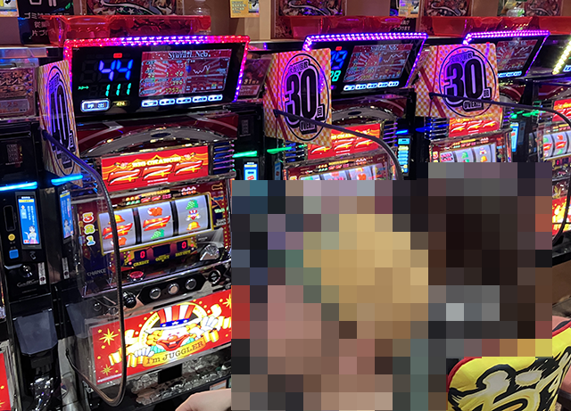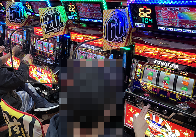 取材時は、「マイジャグラーⅤ」がほぼ満席となっており、うれしそうに遊技をおこなっているプレイヤーが多い。