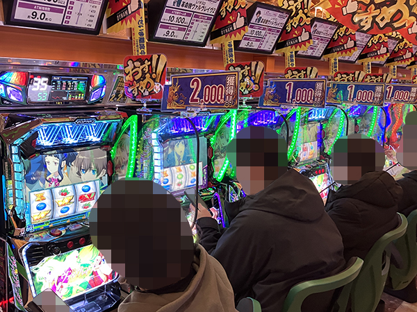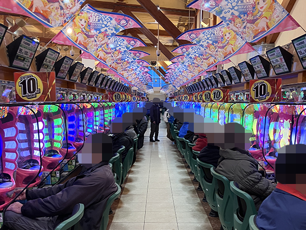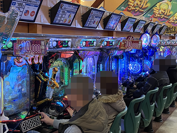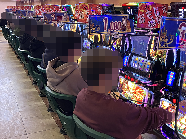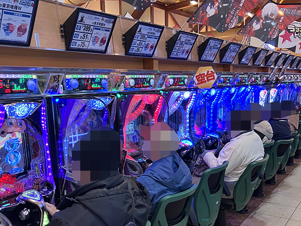 機種構成が魅力的な500円/89枚パチスロを見ると、ほぼ満席となるほどの支持を得ていた。