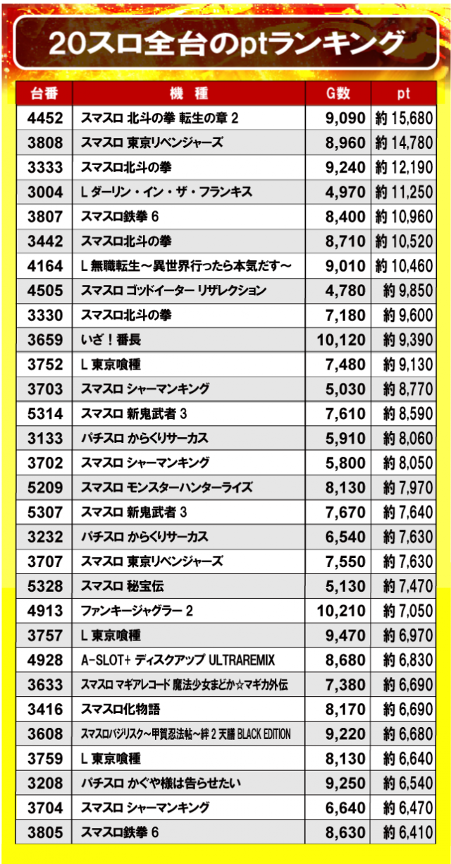 ①20スロ全台のptランキング