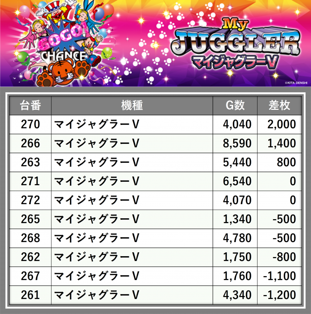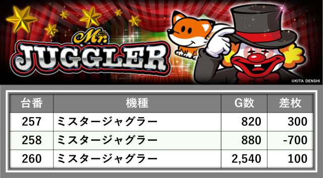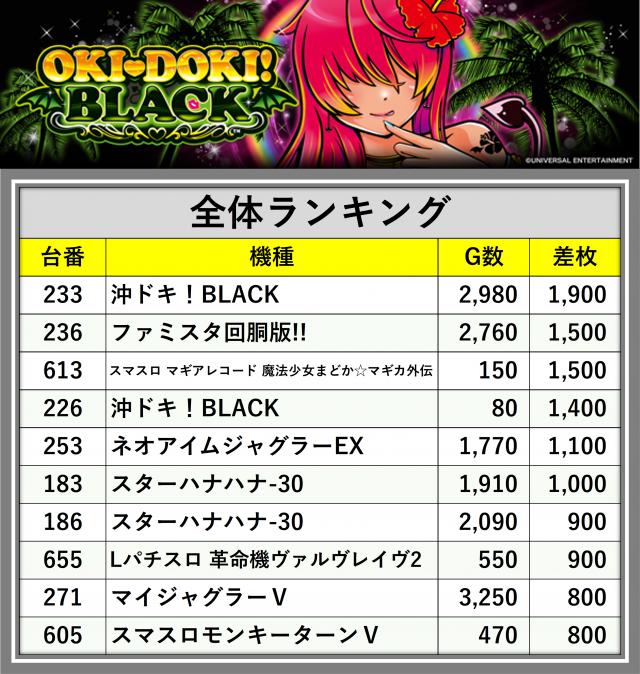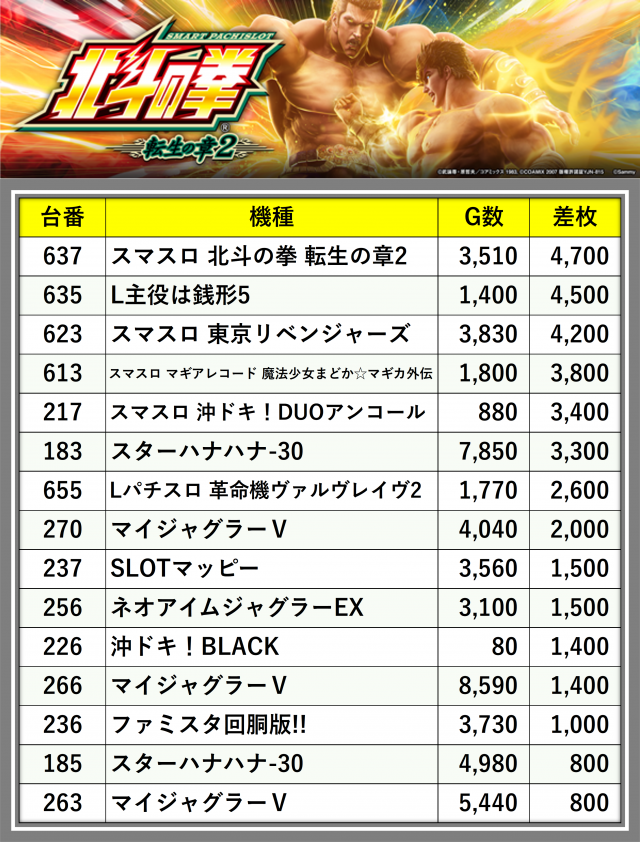 厳選された取材対象機種をはじめ、その他スロット全体から好記録が飛び出した!プレイヤーが楽しんだ1日を下記データにて振り返ってみて欲しい。
