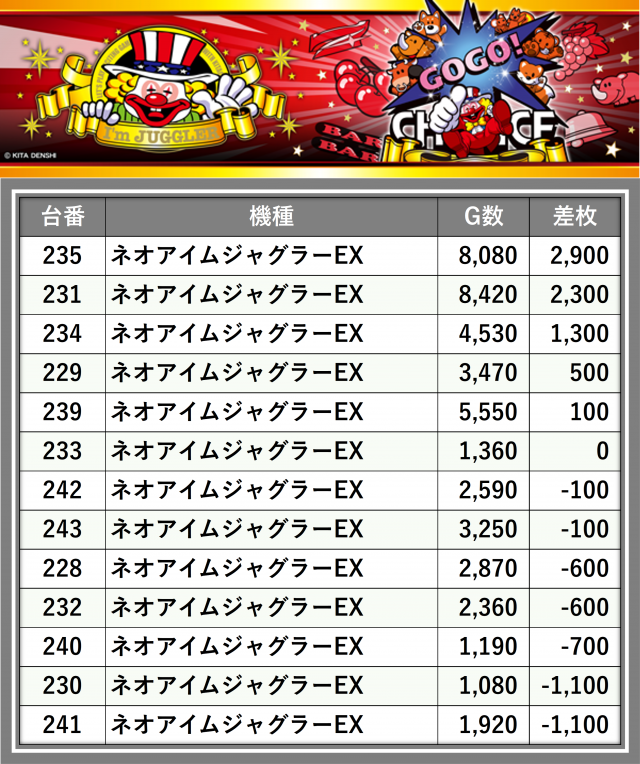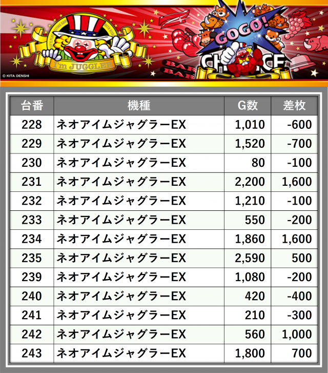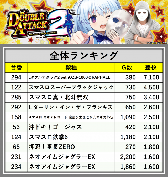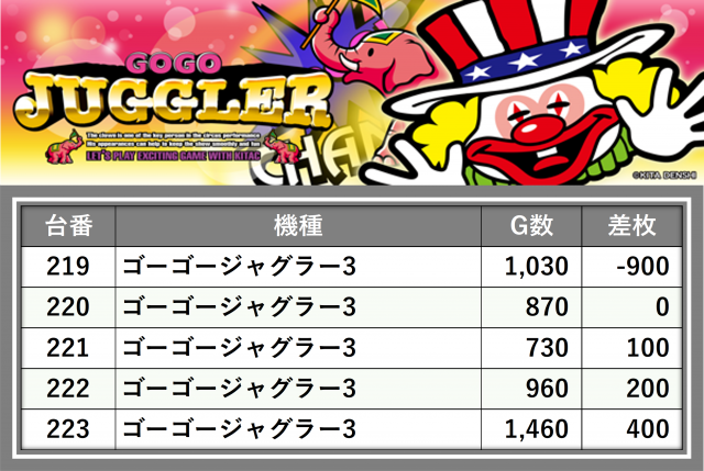 厳選された取材対象機種をはじめ、その他スロット全体から好記録が飛び出した!プレイヤーが楽しんだ1日を下記データにて振り返ってみて欲しい。