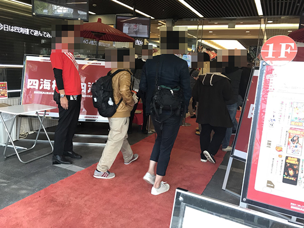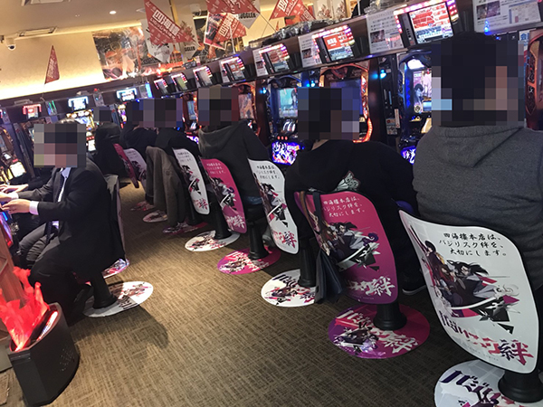 取材日は開店前から80名のプレイヤーが集まり、「CRぱちんこ必殺仕事人V」や「バジリスク~甲賀忍法帖~絆」など、朝から活気に満ちあふれていた。