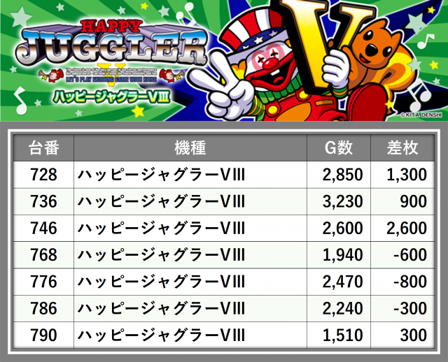 厳選された取材対象機種をはじめ、その他スロット全体から好記録が飛び出した!プレイヤーが楽しんだ1日を下記データにて振り返ってみて欲しい。
