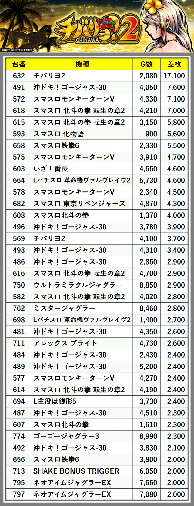 ※差枚数順に掲載しています
