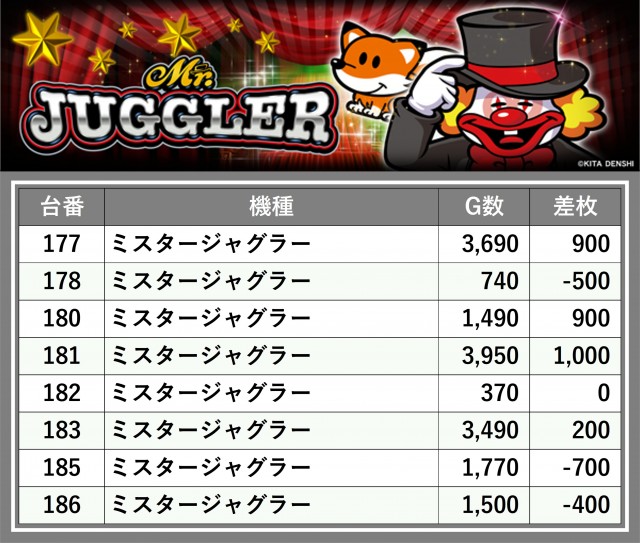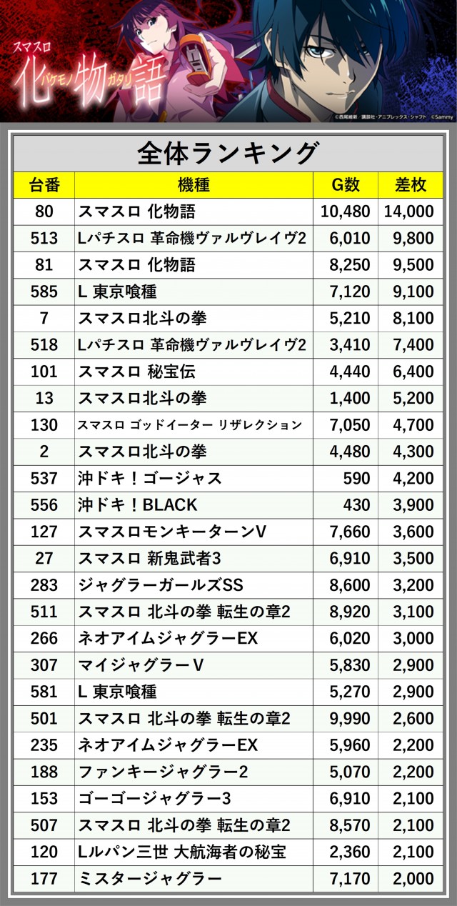 厳選された取材対象機種をはじめ、その他スロット全体から好記録が飛び出した!プレイヤーが楽しんだ1日を下記データにて振り返ってみて欲しい。