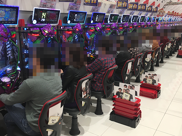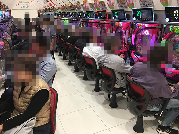 「CRヱヴァンゲリヲン 2018年モデル」や新台の「CR フィーバー LADY GAGA」が満席。プレイヤーたちの明るい表情から楽しんでいることはうかがえたが、取材時の持ち球比率は低かった。