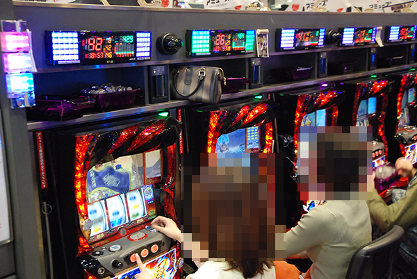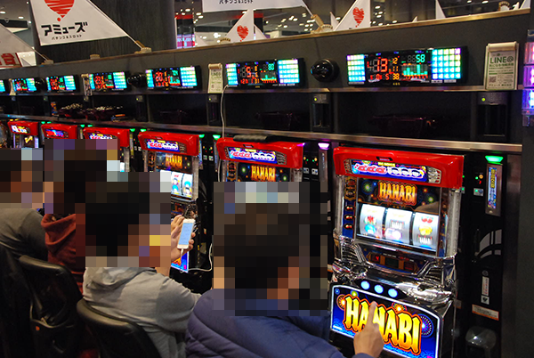 おなじくボーナスタイプであり、満席となっている「ハナビ」も印象的。取材時は箱を使用していたのは1名のみであったが、ほかのプレイヤーも席を離れる様子はなく、遊技を満喫しているようであった。