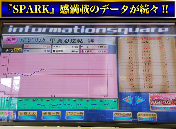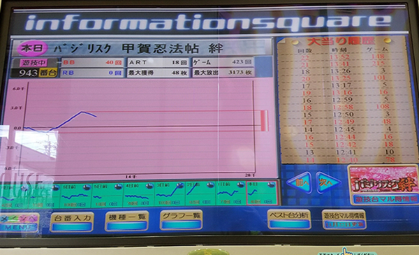「アミューズ八尾店」が魅力的なホールであることを証明するかのように活躍をみせるプレイヤーたち。「バジリスク~甲賀忍法帖~絆」やジャグラーシリーズを包みこむ活気は、伝説となりえるほどに大きく感じられた。