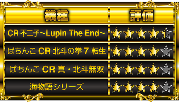 CR不二子〜Lupin The End〜…稼働率100%、出玉感もトップクラス。星4.5個