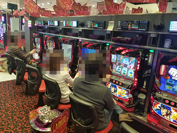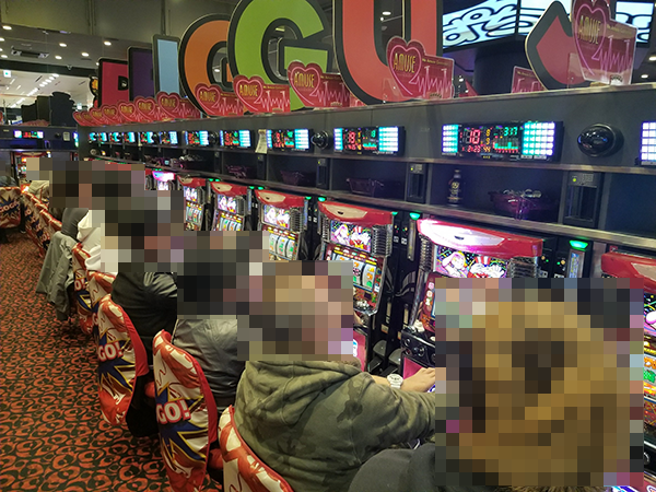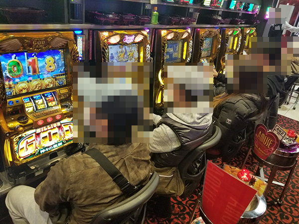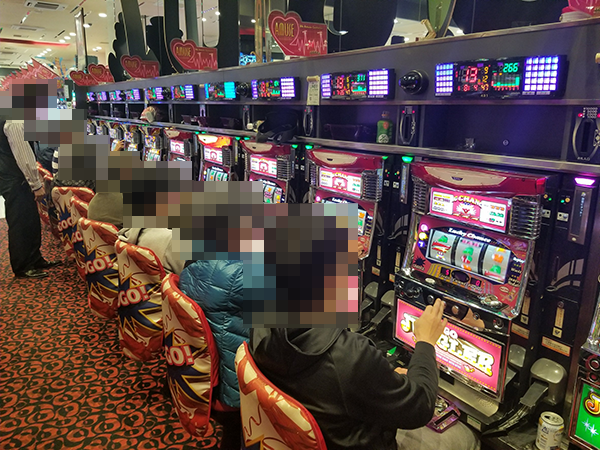 ジャグラーシリーズ全体の稼働率は約70%。「マイジャグラーⅡ」と「ゴーゴージャグラー」がとくに人気を集めており、ほぼ満席となっていたことも印象深い。箱を使用している姿もみられたが、出玉感はまだ若干ひかえめといったイメージを受けた。
