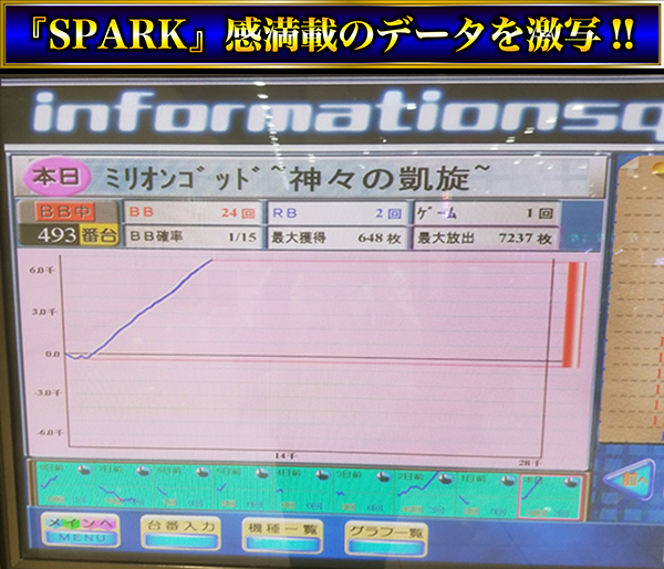 午後のホール内では「ミリオンゴッド-神々の凱旋-」が圧倒的な存在感!! 6台中4台が箱を使用しており、さらにそのうちの2台は5000枚超えを記録。満足そうな様子は周りからも注目されており、空き台を探すプレイヤーたちがシマ内で目撃された。