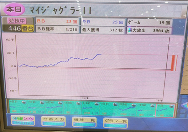 順調にボーナスを重ねる「マイジャグラーⅡ」は3000枚突破!!