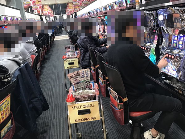 別積みが目立っていた「パチスロ北斗の拳 強敵」は、5台中2台の稼働となっていたが、2名が2箱以上の持ち玉を所持。プレイヤーたちのクオリティの高さがうかがえるワンシーンであった。