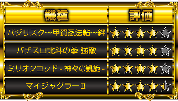 バラエティコーナーの「パチスロ 地獄少女 宵伽」や「バジリスク~甲賀忍法帖~Ⅱ」に、2000枚を超える出玉がみられたことも印象深い。