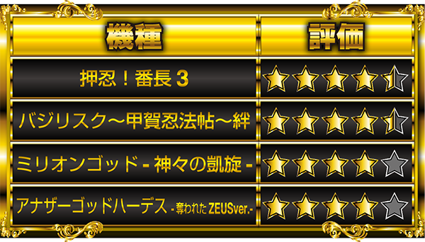 ミリオンゴッド-神々の凱旋-…大量出玉はあるが、全体的にもうひとつといった印象。星4個