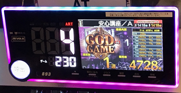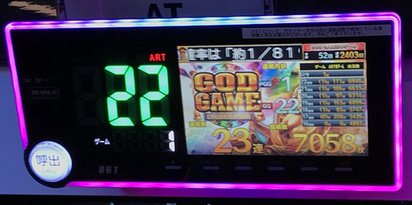 「ミリオンゴッド-神々の凱旋-」や「アナザーゴッドハーデス」の稼働率は約80%。7000枚を超える出玉をはじめ、機種の特徴を活かした魅力的なパフォーマンスを披露している姿も目撃。出玉に差はあったが、目を引かれる存在感は放っていた。