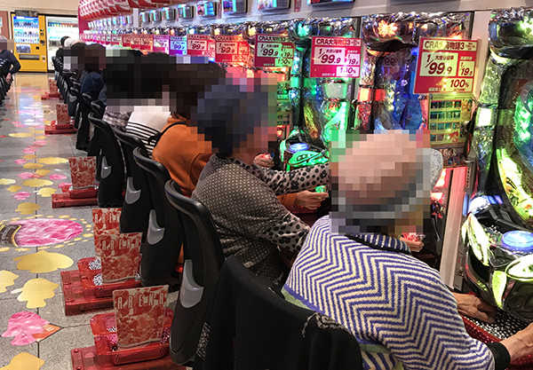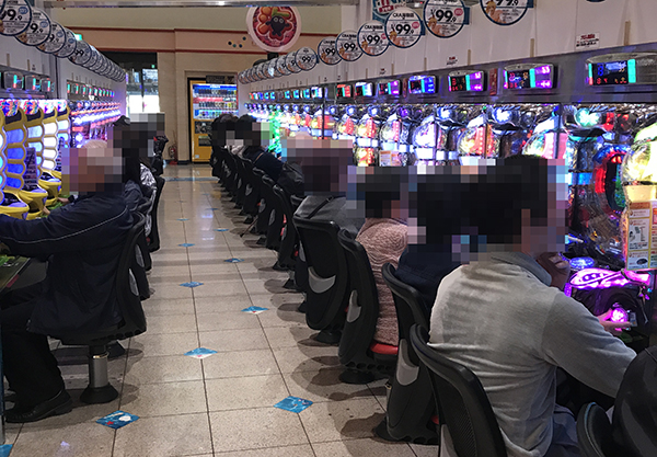1円パチンコでは定番の海物語シリーズが大盛況。満足気な表情をみせる老若男女の姿があった。
