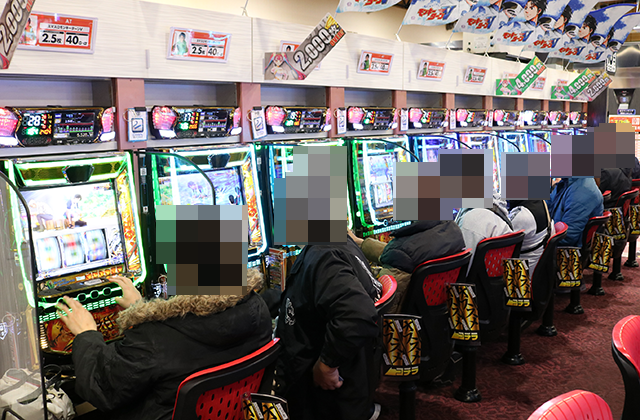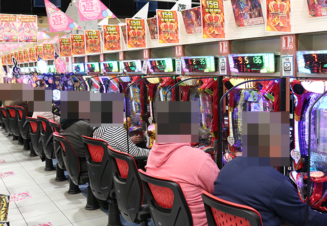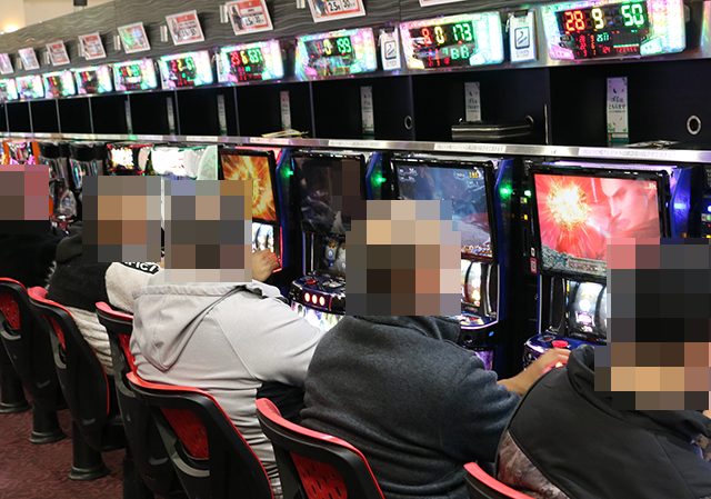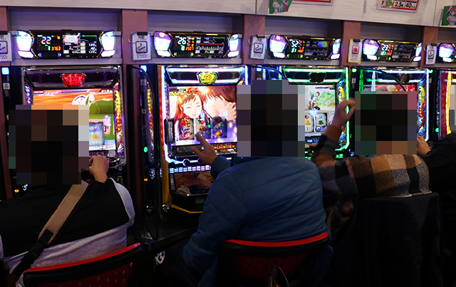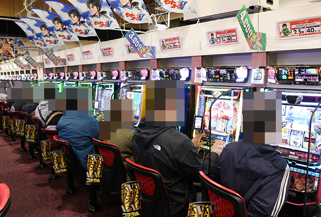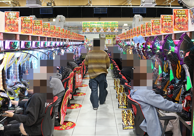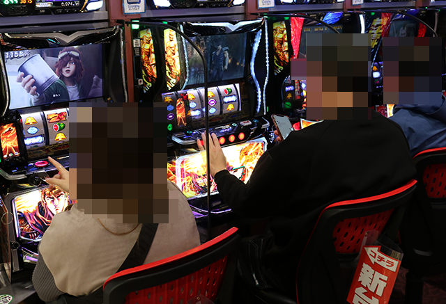 最新機種の「スマスロ 北斗の拳 転生の章2」や「スマスロ 新鬼武者3」も空き台はなく、笑顔のプレイヤーが並んでいた。