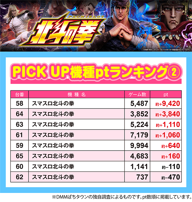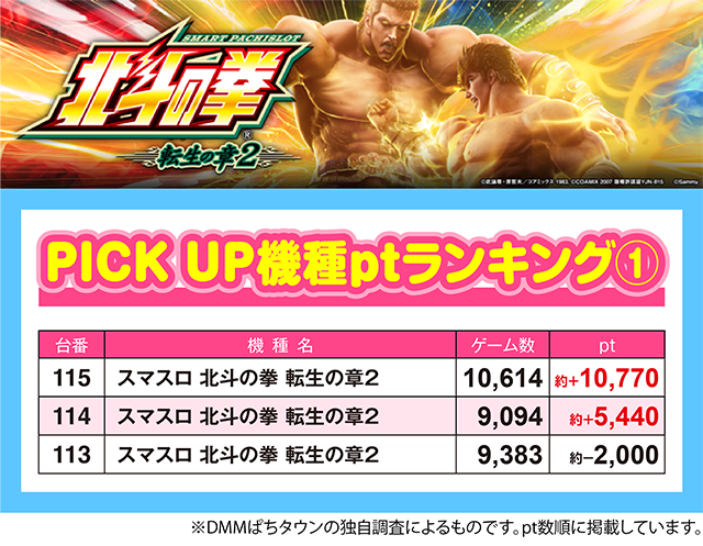 最新機種も活気があり、「スマスロ 北斗の拳 転生の章2」の115番台も約+10,000ptを超えた。