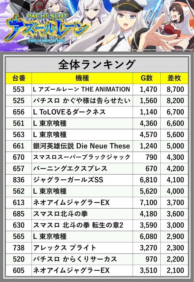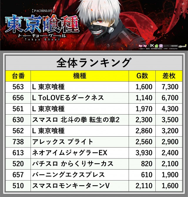 厳選された取材対象機種をはじめ、その他スロット全体から好記録が飛び出した!プレイヤーが楽しんだ1日を下記データにて振り返ってみて欲しい。