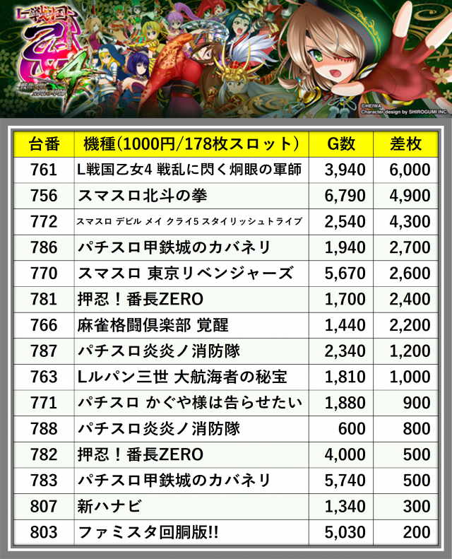 ※差枚数順に掲載しています