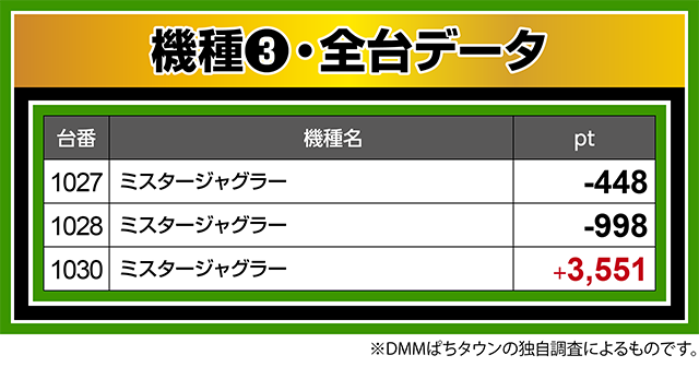 『ミスタージャグラー』もにぎわっており、1030番台が+3,500ptオーバー!