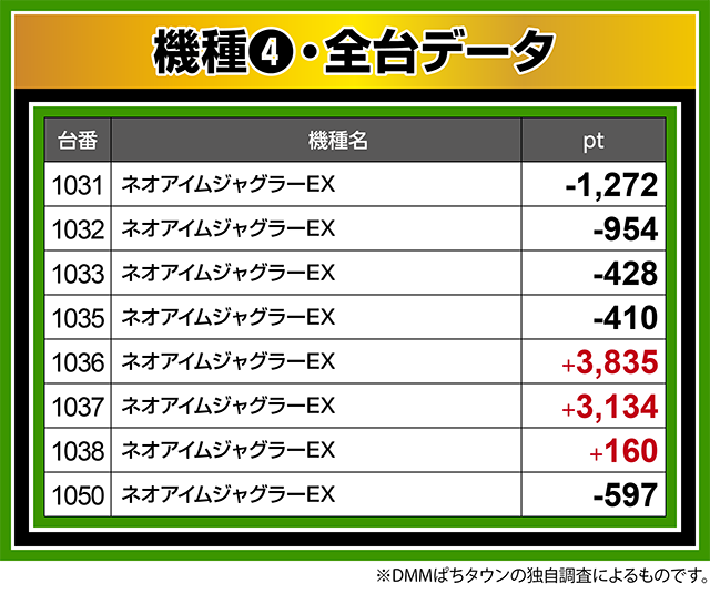『ネオアイムジャグラーEX』では、1036番台が+3,800pt以上。
