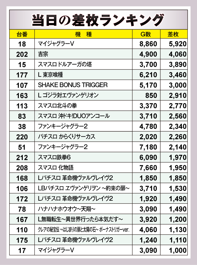 まずは当日の差枚ランキングに注目したい。トップに輝いたのは18番台の「マイジャグラーV」で、差枚は+5,920枚を記録。続く202番台「吉宗」は+4,060枚、15番台「スマスロドルアーガの塔」も+3,890枚と高水準の出玉を披露している。さらに「L 東京喰種」「SHAKE BONUS TRIGGER」「L ゴジラ対エヴァンゲリオン」など、AT機からノーマルタイプまで幅広い機種が上位に名を連ね、多彩な機種構成で盛り上がりを形成していた点は非常に印象的だ。スマスロ・ジャグラーシリーズがバランス良く結果を残しており、スロットコーナー全体の状況が良好であったことは数字が明確に物語っている。