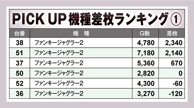続いては、ピックアップ機種にスポットを当てていこう。まず存在感を放っていたのが「ファンキージャグラー2」だ。38番台が+2,340枚、51番台が+2,140枚としっかり結果を残し、いずれも4,000G超~7,000G超と高い回転数を記録。プレイヤーが手応えを掴み、粘り強く打ち込んでいた様子がはっきりと伝わってきた。