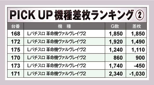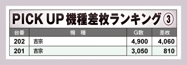 さらに「Lパチスロ 革命機ヴァルヴレイヴ2」も見逃せない。168番台は+1,850枚、172番台は+1,490枚、175番台も+1,110枚と複数台がプラス差枚を記録し、シリーズ全体で確かな盛り上がりを形成していた。加えて「吉宗」も202番台がランキング上位に食い込み、ピックアップ機種としての期待に応える結果を叩き出している。いずれの機種も回転数が伴っており、プレイヤーが確信を持って長時間遊技していた事実は明白だ。