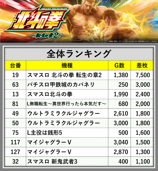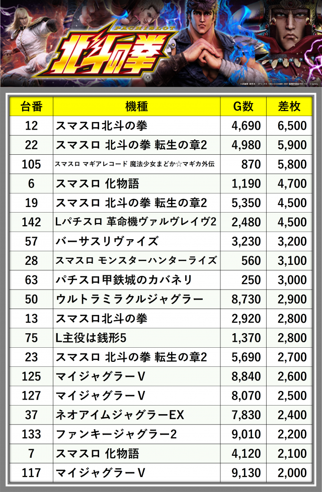 ※差枚数順に掲載しています