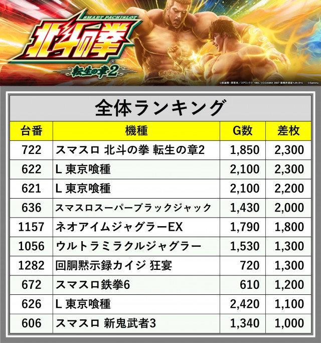 厳選された取材対象機種をはじめ、その他スロット全体から好記録が飛び出した!プレイヤーが楽しんだ1日を下記データにて振り返ってみて欲しい。