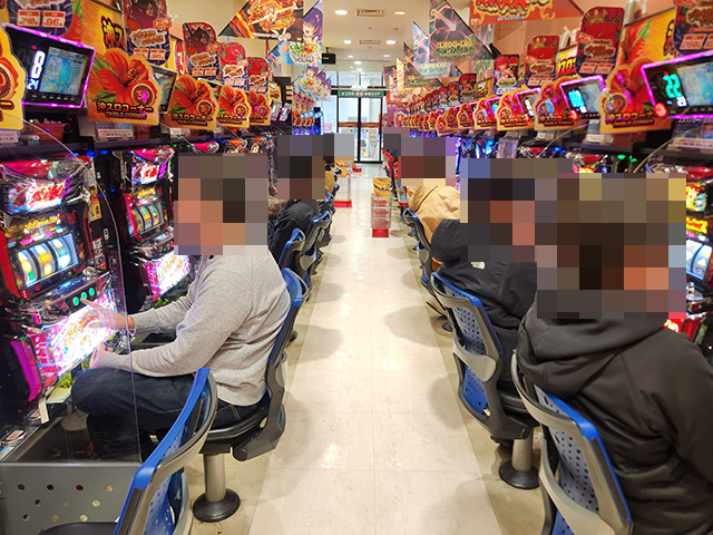 「キングハナハナ-30」や「ネオアイムジャグラーEX」など、あちこちで華やかなシーンがみられた。