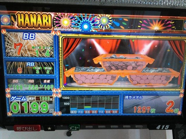 上げ狙いの台の調子がいい。というわけで、前日回数のついていない「ハナビ」に着席。ダラダラ打つと取り返しがつかなくなるためそろそろ落ち着きたい所。