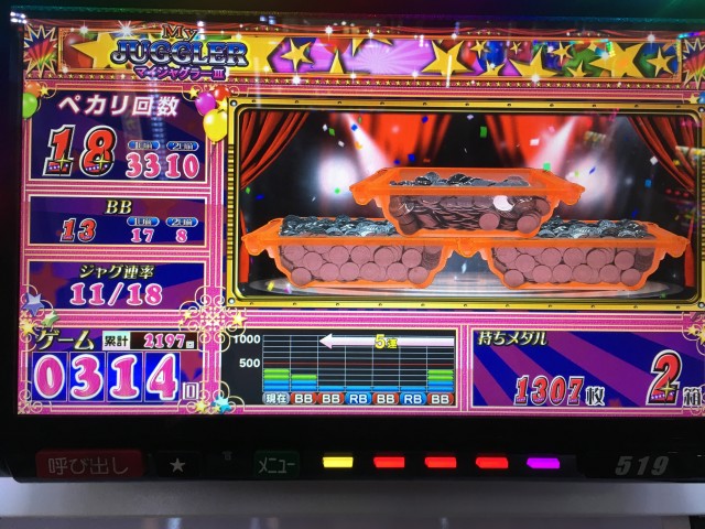 私の方はというと、なぜかBIG18 REG13で総回転2197G?と勘違いした「マイジャグラーⅢ」をしばらく打って収支を減らしてしまいました。笑(追加4K)