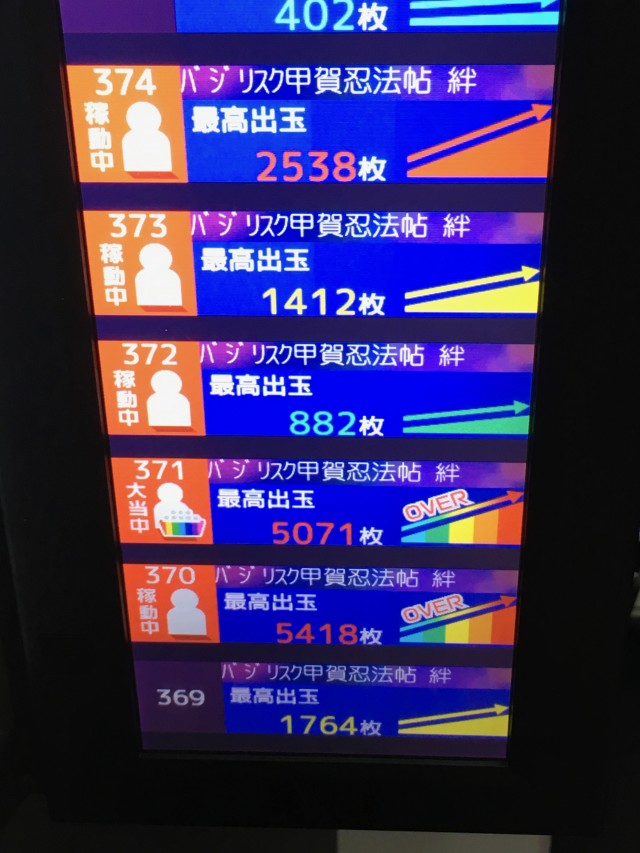 続いて「押忍!番長3」で18台、「バジリスク〜甲賀忍法帖〜絆」14台。