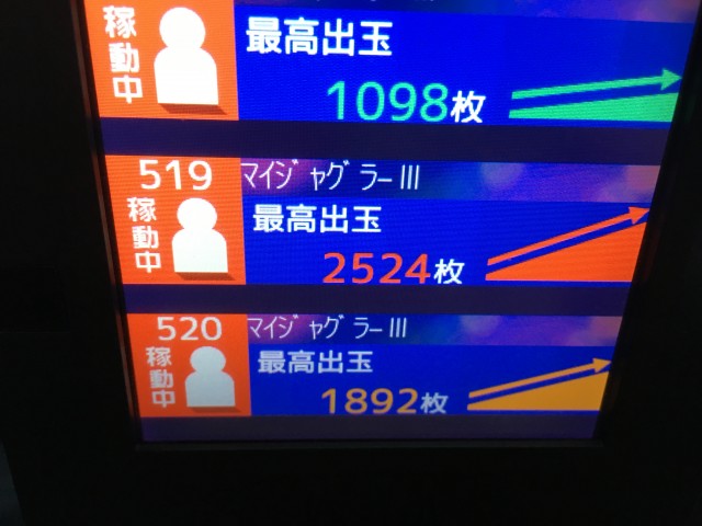 朝から満台。複数台変更挙動を示しており、角台2、3が早い初当り。