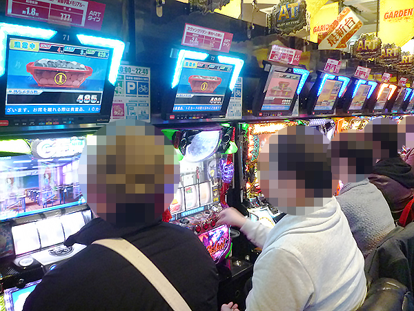 14時ごろに1000円/47枚パチスロをチェックすると、「押忍!番長3」や「バジリスク~甲賀忍法帖~絆」、「パチスロ聖闘士星矢 海皇覚醒」などが大盛況。シマのあちこちで華やかな光景を目にしている。