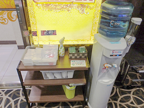 店内を見ると手袋やおしぼりなどのアメニティグッズが充実。加えてウォーターサーバーも用意されており、プレイヤーたちは自由に美味しい水を飲むことができる。