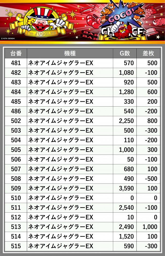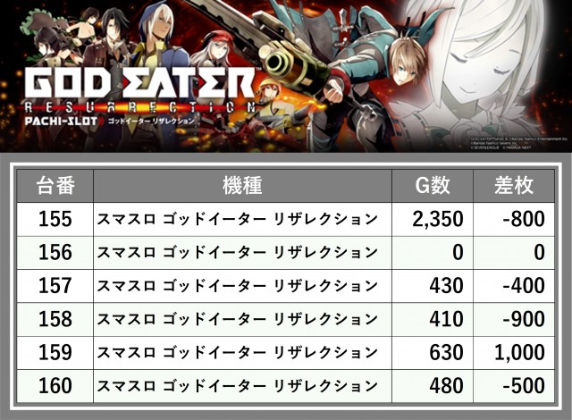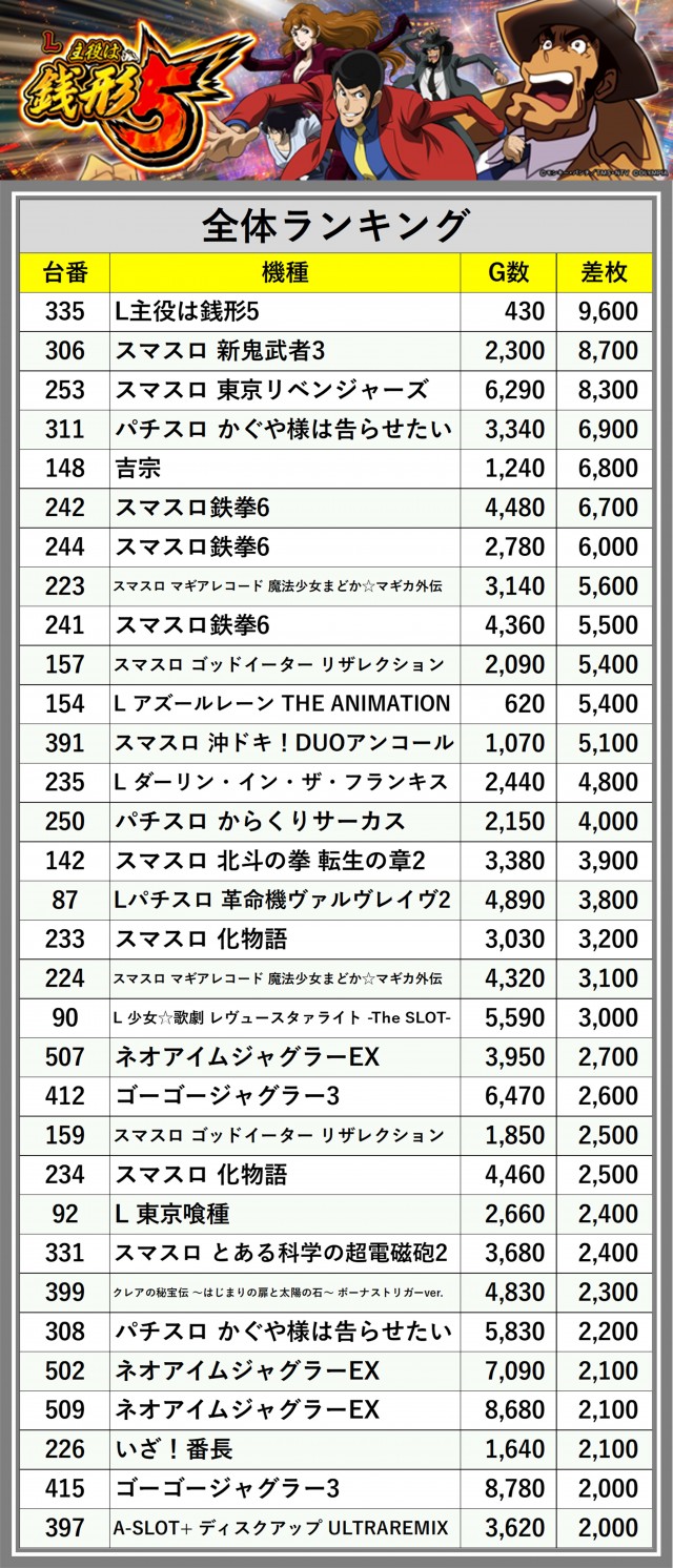 厳選された取材対象機種をはじめ、その他スロット全体から好記録が飛び出した!プレイヤーが楽しんだ1日を下記データにて振り返ってみて欲しい。
