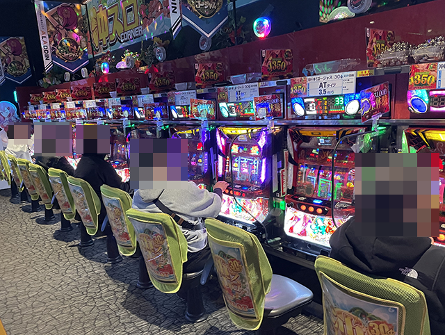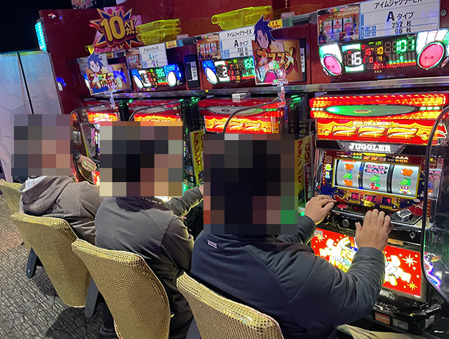 「アイムジャグラーEX」に空き台はなく、プレイヤーたちは楽しそうに遊技中。