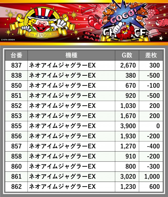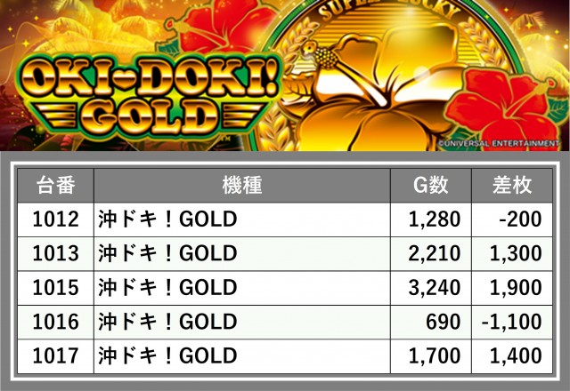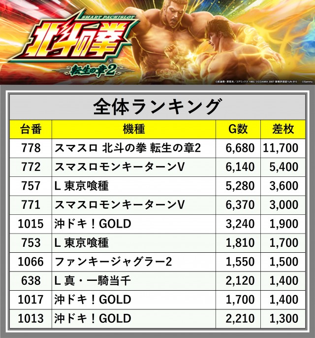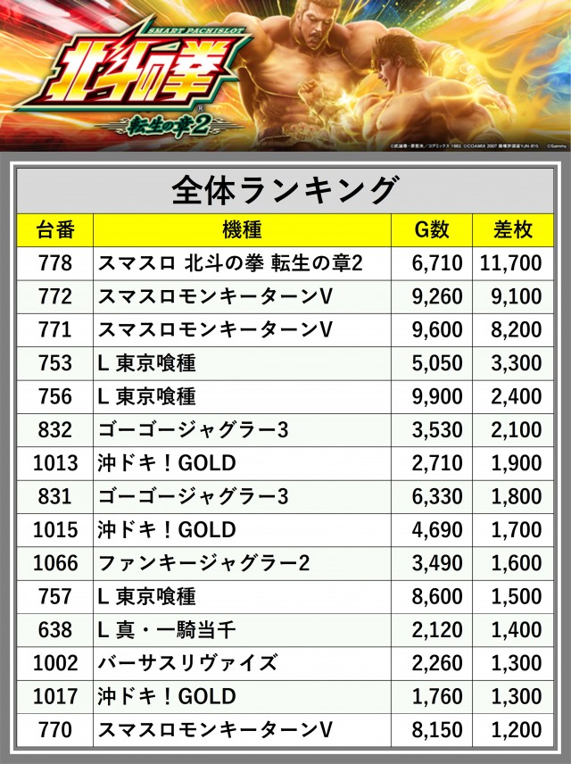 厳選された取材対象機種をはじめ、その他スロット全体から好記録が飛び出した!プレイヤーが楽しんだ1日を下記データにて振り返ってみて欲しい。