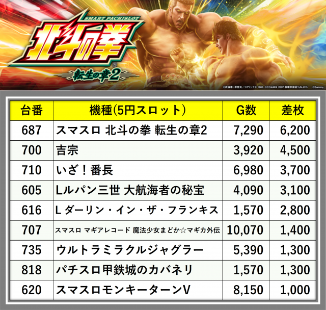 厳選された取材対象機種をはじめ、その他スロット全体から好記録が飛び出した!プレイヤーが楽しんだ1日を下記データにて振り返ってみて欲しい。