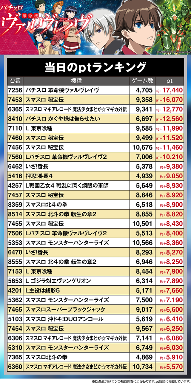 「L 東京喰種」の7110番台と「Lパチスロ 革命機ヴァルヴレイヴ2」の7560番台も約+10,000ptオーバーと、いくつもの台が好結果となった。